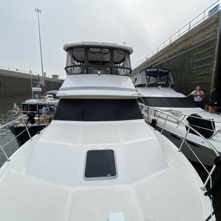 anchor light to bring our air draft, or height, from 18'2" to 15'11.5", at the top of the radar arch, so we could get under the bridges going through downtown Chicago. That day we were travelling with our new buddy boat, Off Leash, and joined by three other boats in the first lock: Blue Moon, Sunset, and Island Wanderer. We continued with them all day through Chicago. By all our careful measurements